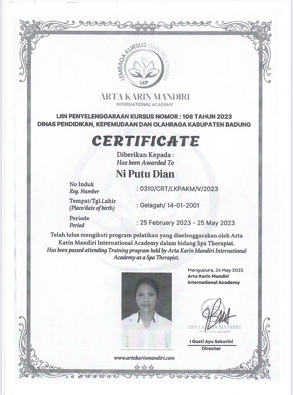 Образование: Сертификат Министерства Здравоохранения Таиланда